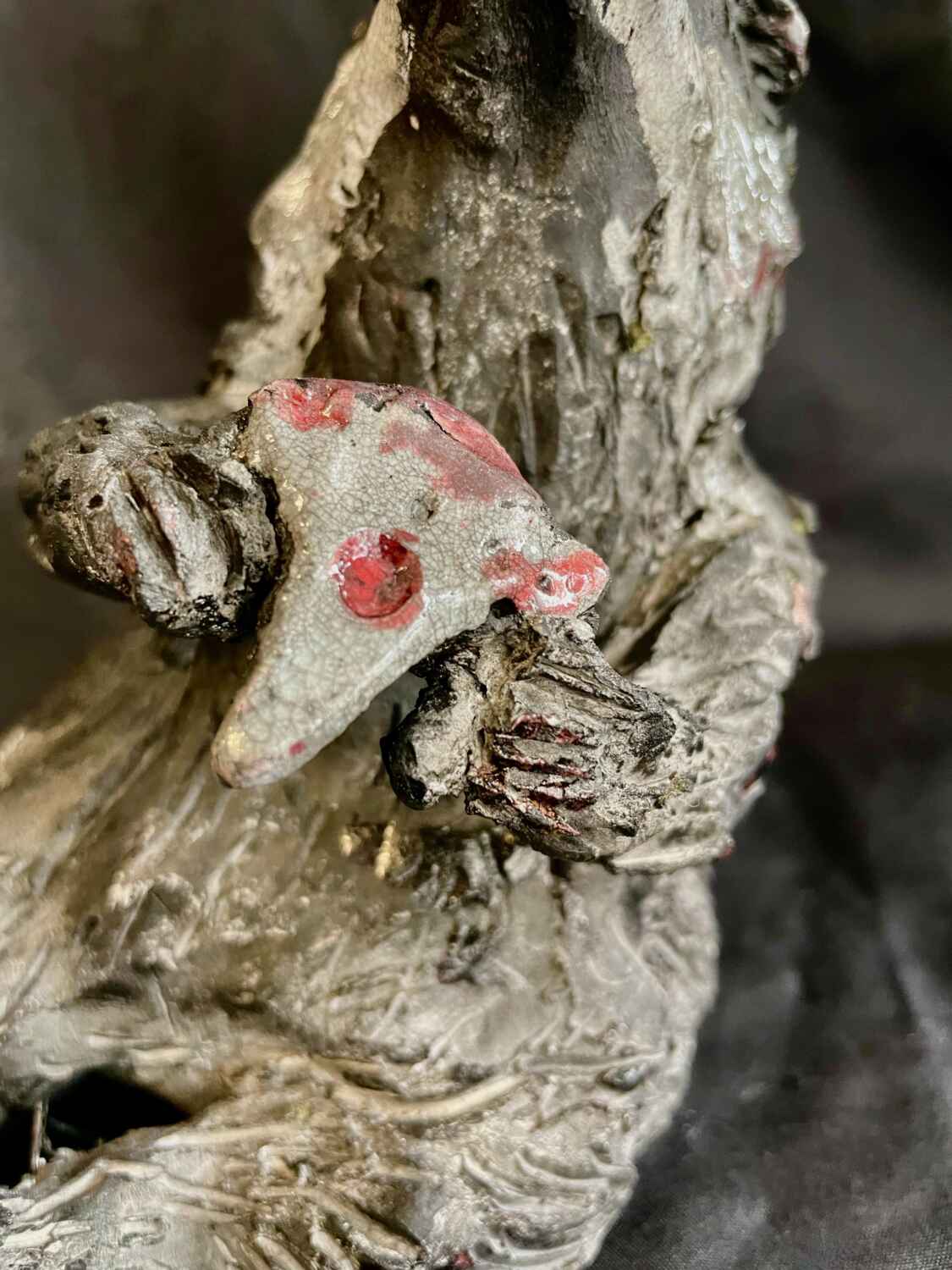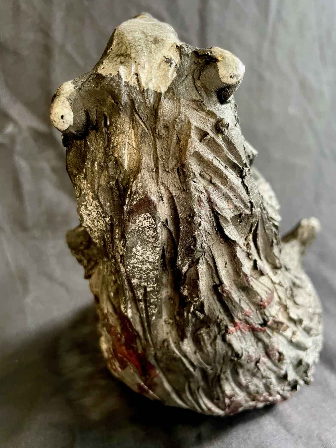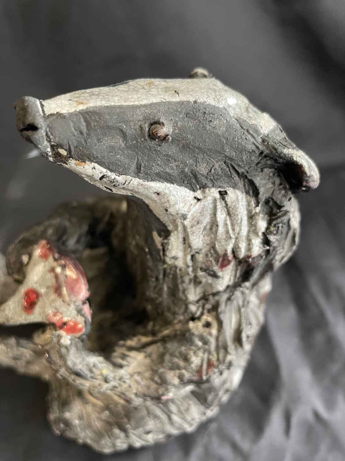 Badgerman is handcrafted in clay and raku fired for a delicious smokey look. He has crackle glaze on his white bits and metallic highlights in his hair. He is retro gaming with a Nintendo 64 controller. Dimensions: H,14cm, W,14cm, D,14cm