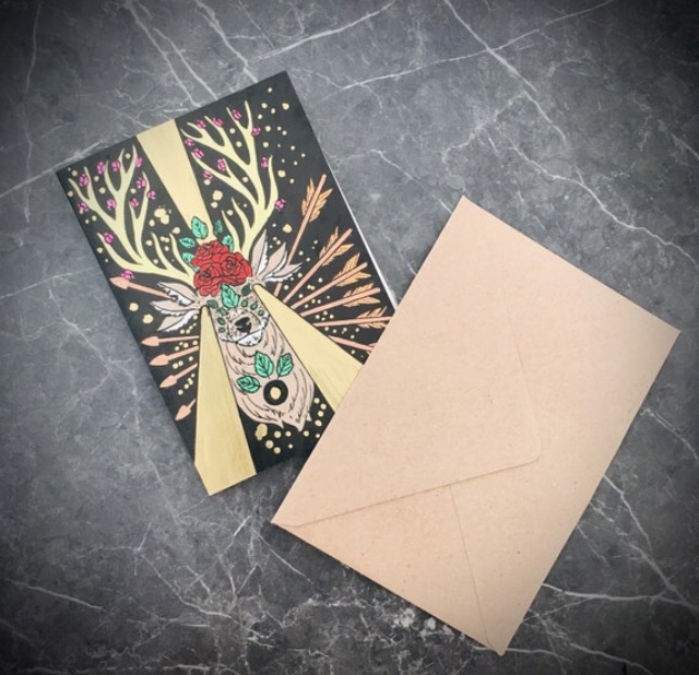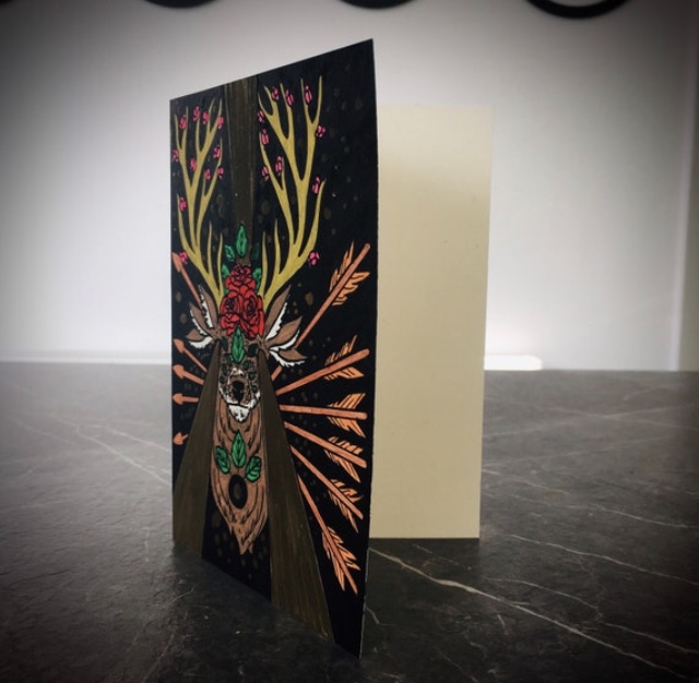 A hand made and hand inked inked greetings card featuring my God Deer design