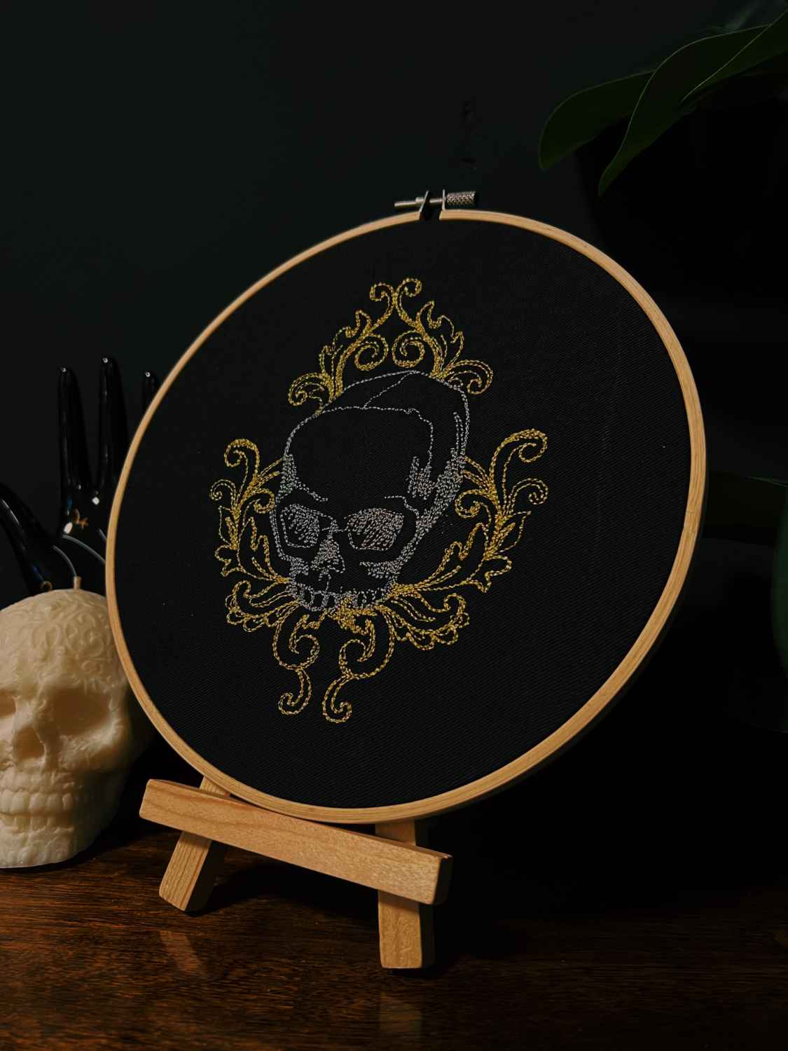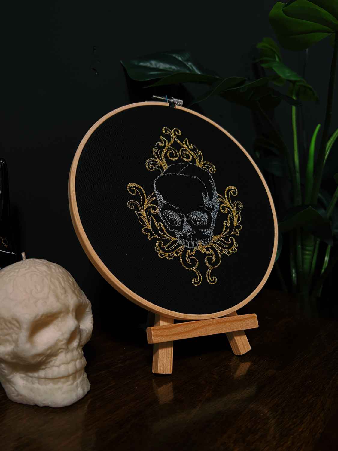 Skull design embroidered with grey a metallic Gold Thread With wooden backing.